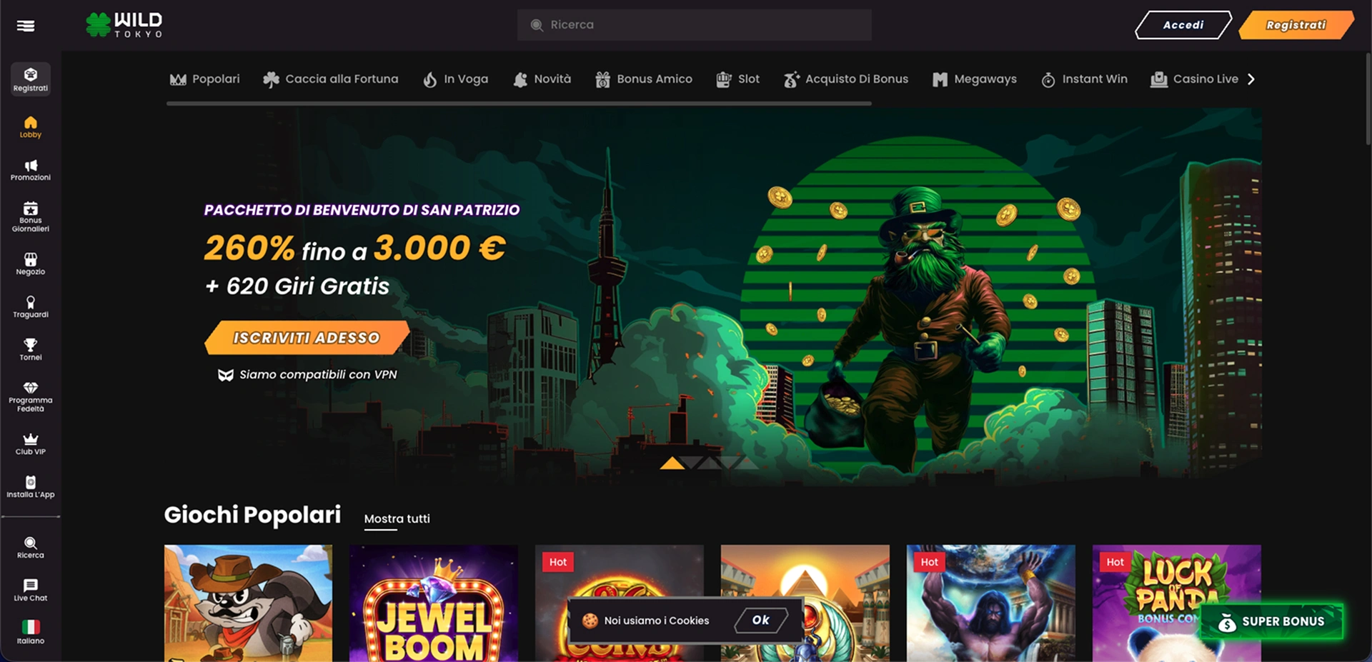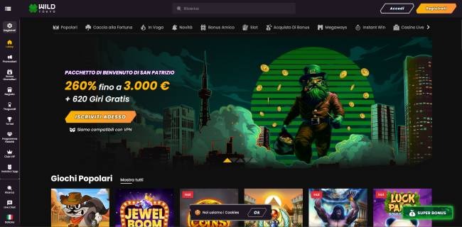 Il pacchetto di benvenuto del 260% fino a 3.000€ + 620 giri gratis posiziona Wild Tokyo tra i casinò non AAMS più generosi del mercato. La piattaforma offre un catalogo impressionante di oltre 4.000 giochi, incluse le slot più popolari e un’ampia sezione di live casinò.